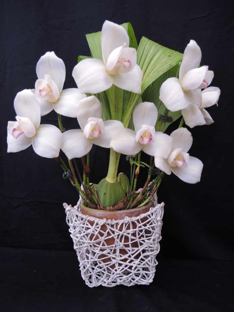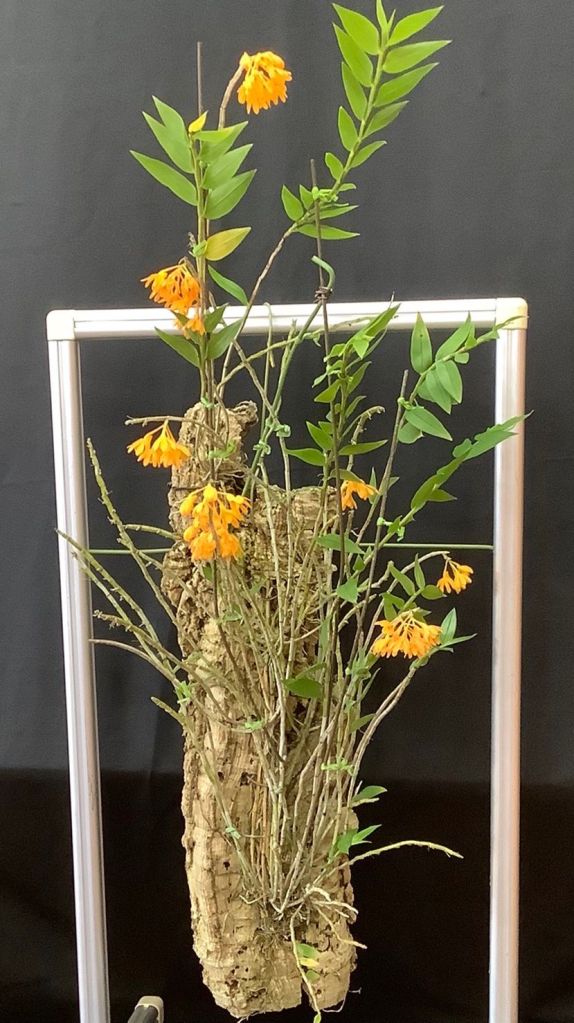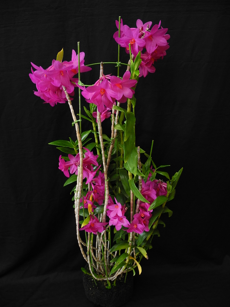 一度冬の寒さと乾燥で弱らしてしまったのですがその後プラ鉢+バークから素焼き鉢+水苔にしたところ一気に回復し翌年には6輪も咲いてくれたので大変うれしく思いました。やはりこの手のモーディエは水が好きなんだと再確認しました。また栽培のみでなく仕立てに関しても注目していただきたいです。つぼみが伸びてくる段階で光源の向きを調節したり、つぼみの先端と基部に支柱を当てるなど毎日の微調整により全ての花を一面に向かせることが出来ました。
