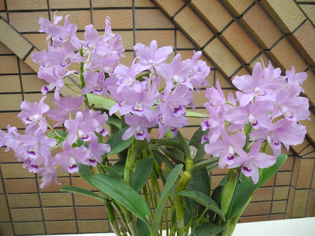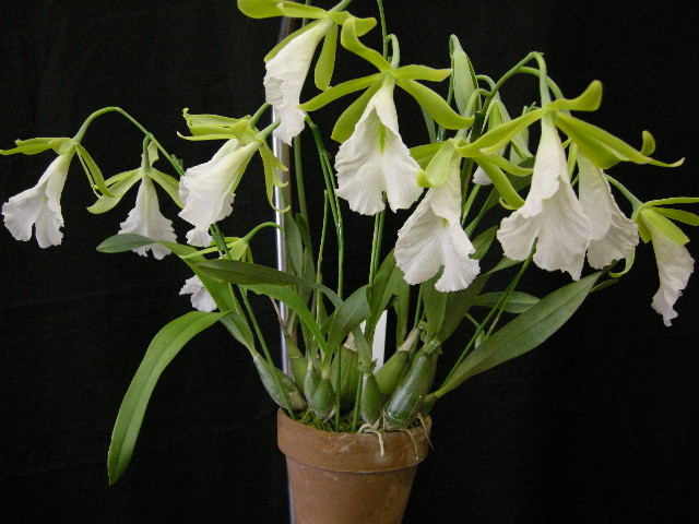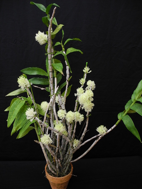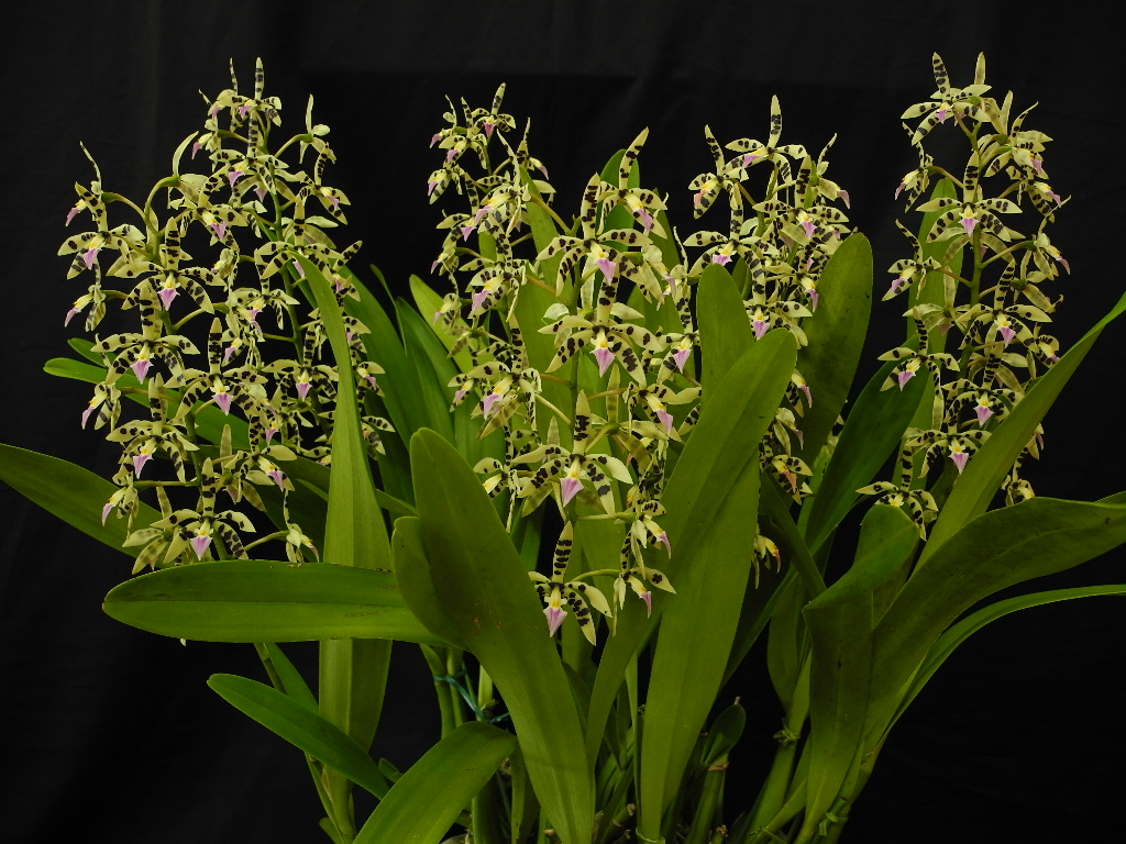 2013年2月の東京ドームで五島園芸さんより購入しました。昨年2月の例会で7輪咲きで入賞しています。今年は8輪咲きで、立川のJOGA蘭展がちょうど見ごろだったのですが中止でガッカリ!でも何とか例会までは持たせたいと温室の下段でじっと我慢させました。昨年6月から9月下旬まで蓼科高原に山上げし、10月からは温室上段の日当たりの良い所に置き、花芽が出てきた時は感動でした。下の4芽はあっちこっち向いて揃えるのに苦労しました。さっそく花を切り、植え替えです