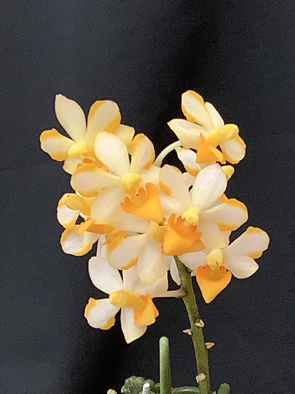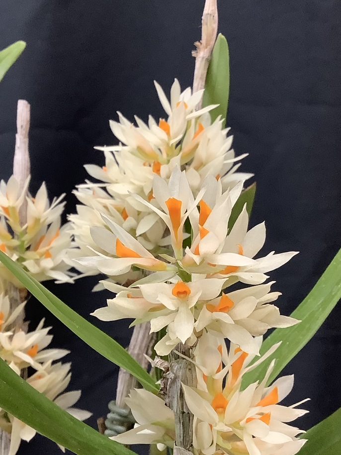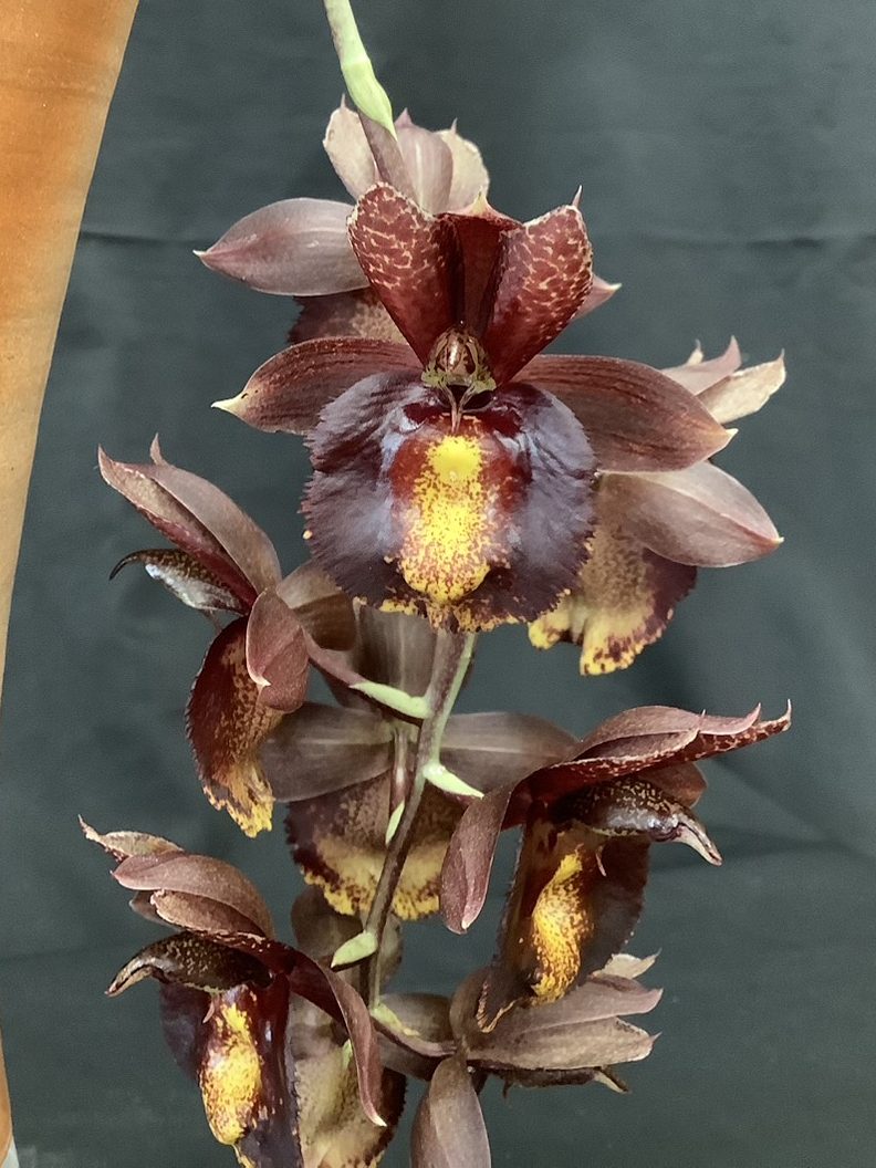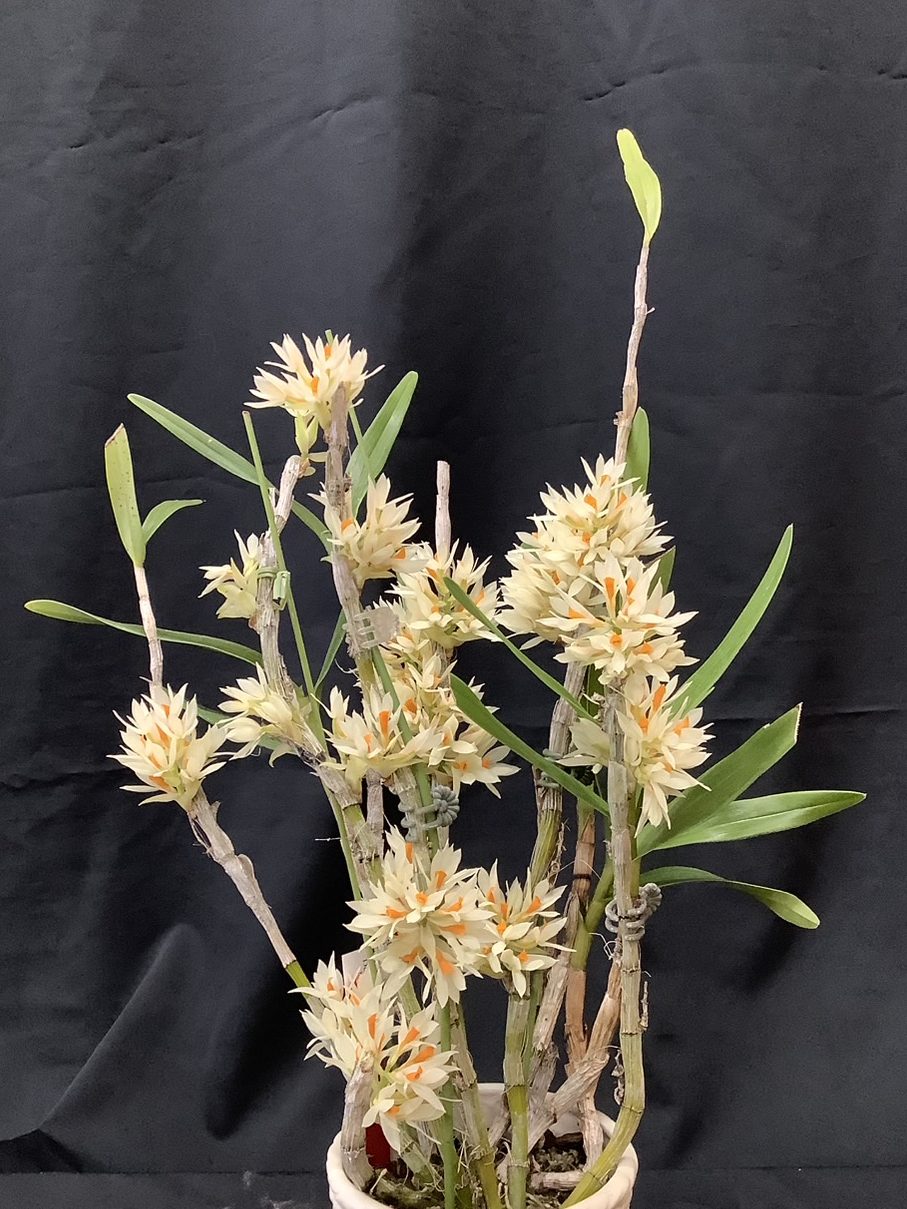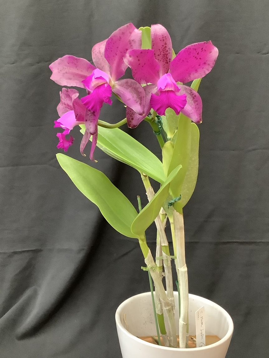 2022年登録の交配種で、プラ鉢水苔植えになっています。薄い葉でハダニが付きやすいので新芽が伸び始めたところで「オルトランDX」を置いてやり、1~2か月経ってから2回目を置きます。ハダニの予防として新芽がある程度伸びたところで少し高い場所に吊るしてやり、潅水時にハダニを飛ばすイメージで葉裏に勢いよく水を掛けます。肥料は好きなようで新芽から根が伸び始めたころに少し大きめの置き肥をしてやるとバルブが大きくなります。葉が落ちたので新芽が出るまで、これからは水を控えて常に乾いてるような状態にします。この間の潅水は週に一度、軽くやる程度にします。植え替えは少なくとも2年に一度の頻度で行います。(石井様)