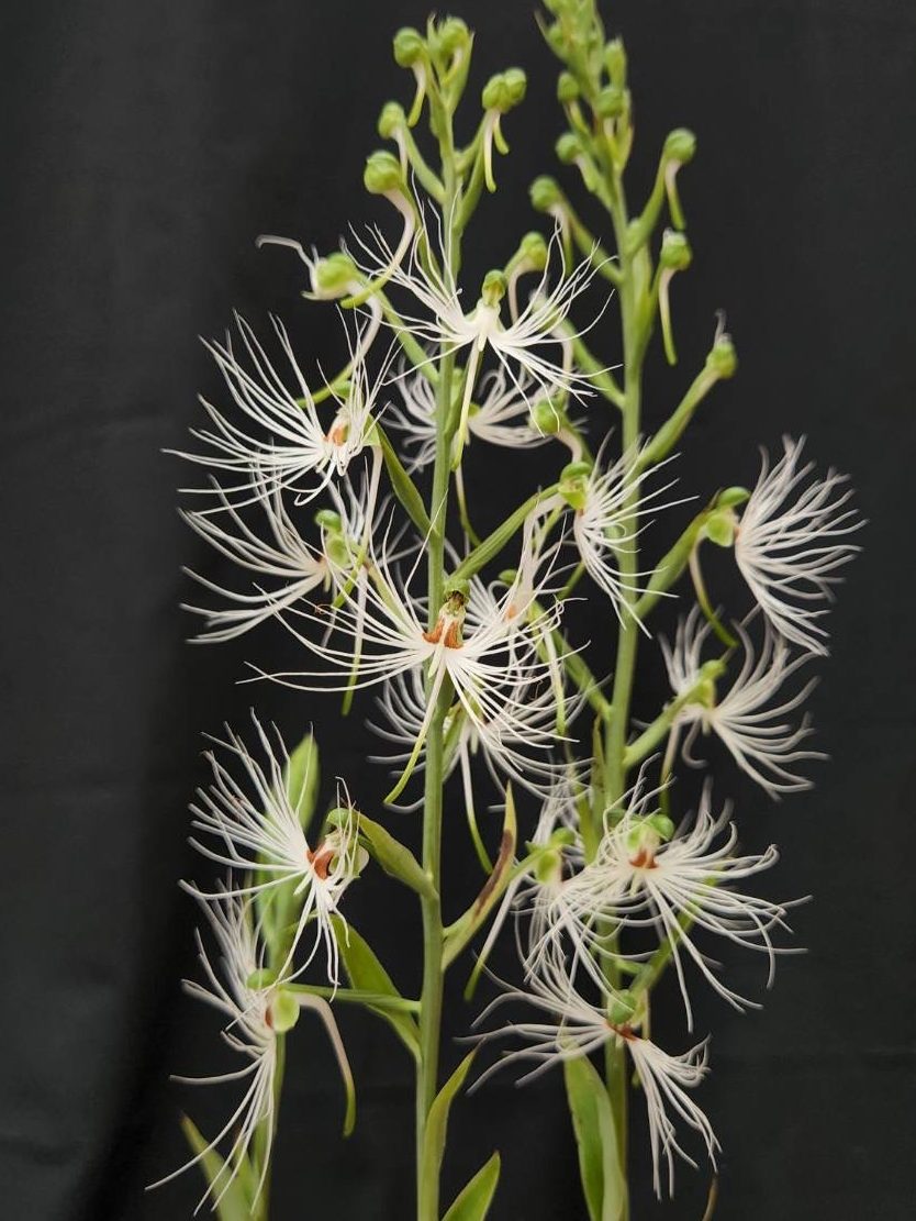 日本のサギ草の仲間で、本種はマレーシア産。プラ鉢に日向土植えです。休眠期は完全に球根状態になり、その後新芽が伸び始め今頃に開花、花が終わると地上部は枯れます。地上部が枯れたら低温(5℃)の温室に置き、10日に1度くらい軽く潅水します。植え替えは毎年、休眠期の1~2月に行います。3月の中旬ぐらいから新芽が見えなくても徐々に潅水量を増やしていき、新芽が見え始めたら置き肥「ロングトータル花卉用100」を与えます。今までは5月の連休くらいから50%の遮光の下の野外に置いていましたが、ここ数年は酷暑の為に葉が焼けたのか黒い病斑が出るので来年はもう少し遮光を強くしてやろうと思います。(石井様)